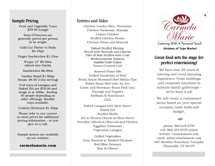 Our sister company, Carmela Marie offers full service catering. We will arrange for service staff, liquor service, floral arrangements, china and linens.